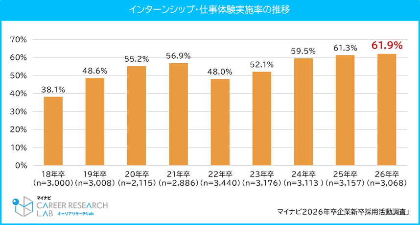 さらに、インターンシップ求人と本選考求人を併用掲載した場合、インターンシップの成果報酬は無料で利用できます。マイナビの調査によると、26年卒のインターンシップ・仕事体験の実施率は61.9%に達しており、18年卒の38.1%から一貫して上昇を続けています。