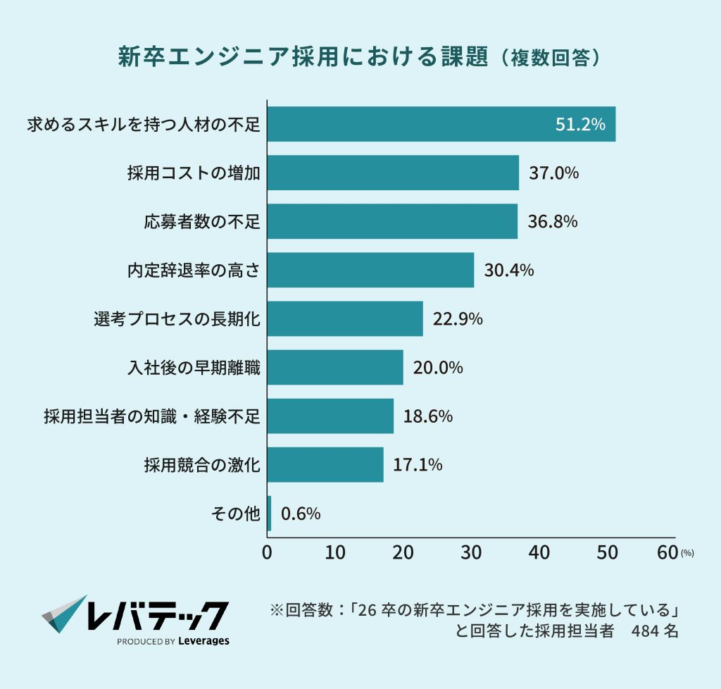 新卒エンジニア採用において、採用担当者がスキル評価に悩むケースは少なくありません。レバテックの調査(484名の採用担当者回答)によると、26卒の新卒エンジニア採用において技術力の見極めに課題を感じている企業が一定数存在することがデータからも示されており、採用ミスマッチは入社後の育成コストにも直結します。