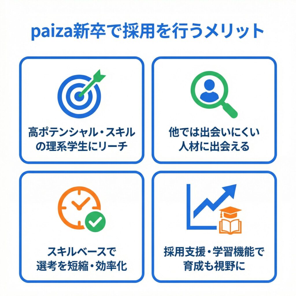 サービスの特徴を把握した上で、次に気になるのは「実際にどんなメリットがあるか」という実務的な観点です。paiza新卒の設計から生まれる採用上の優位性を、具体的な場面ごとに整理します。