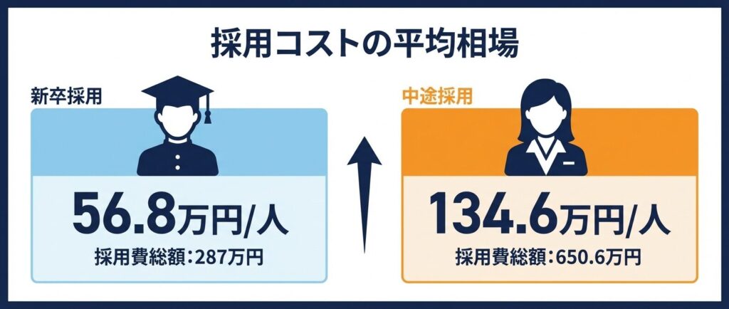 採用活動を行う上で、まず把握しておきたいのが採用コストの相場です。新卒採用の平均採用単価は約56.8万円、中途採用の平均採用単価は約134.6万円となっています。