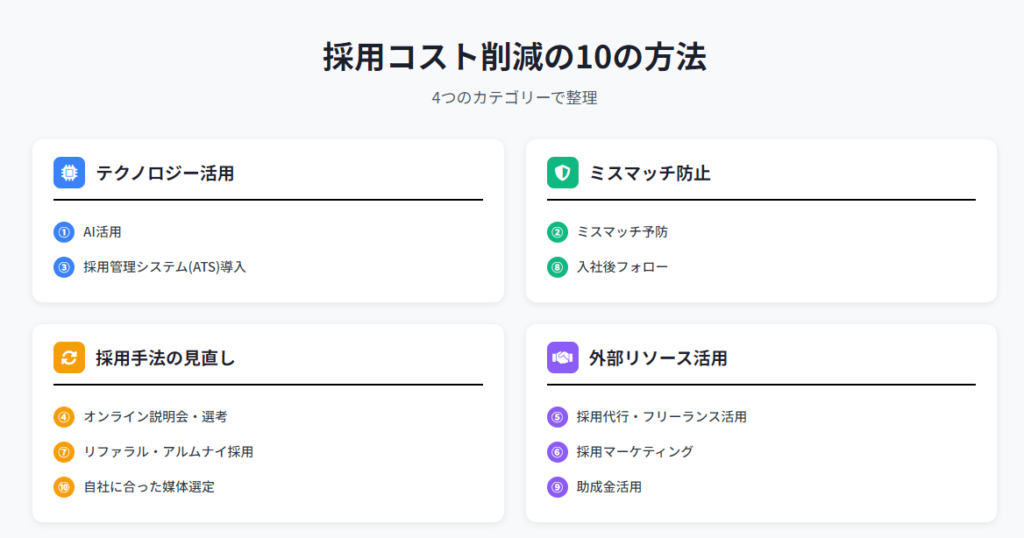 採用コストの削減は、単に費用を抑えるだけでなく、採用活動全体の効率化につながる取り組みといえます。ここからは、実践的な10の削減方法を詳しく解説していきます。