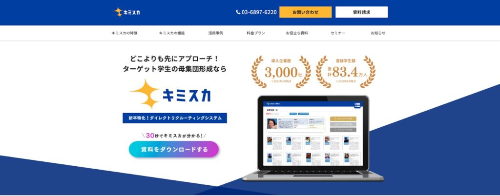 キミスカは累計83.4万人の学生が登録する新卒特化型ダイレクトリクルーティングサービスです。