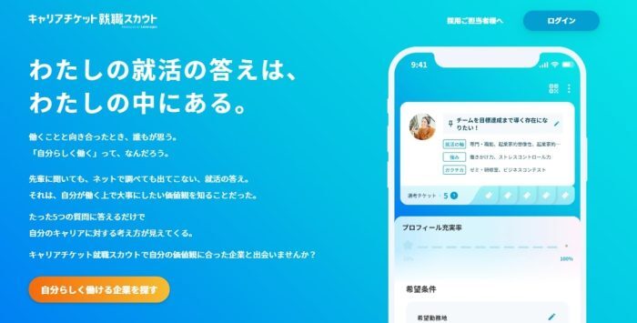 適性検査を活用した科学的なマッチングに加えて、学生の志向性や価値観を詳しく把握できるプロフィール設計が特徴です。