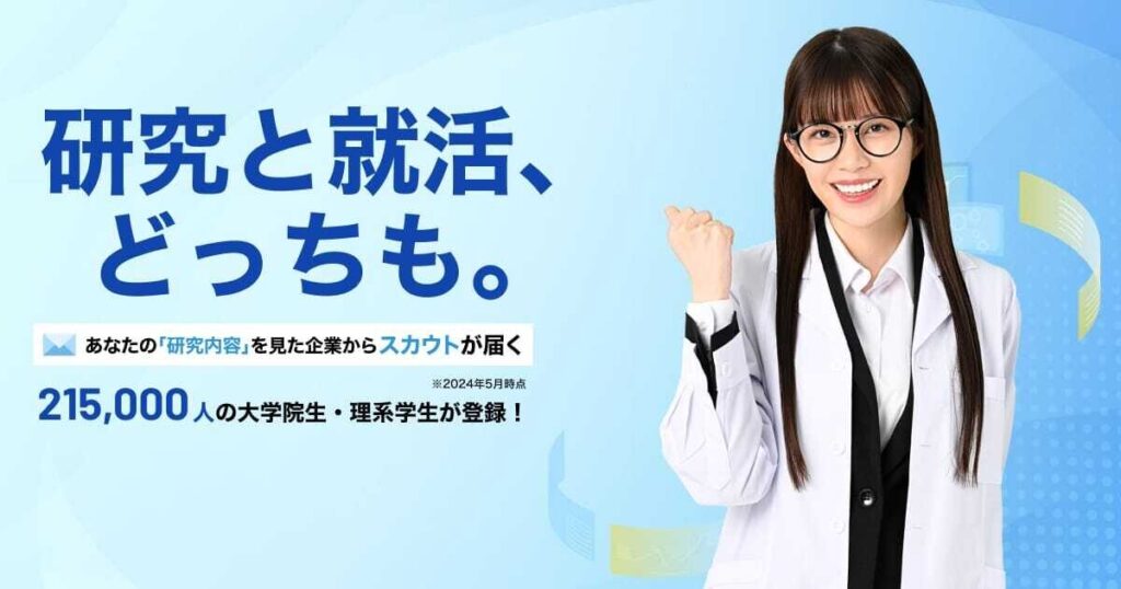 全国の理工系学生約18万人が登録しており、研究内容や専門分野から学生を検索できる点が最大の特徴となります。
