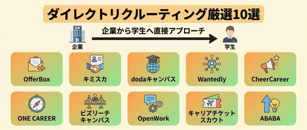 | ダイレクトリクルーティング | 企業から学生に直接アプローチ | ピンポイント採用・認知度不問 | 中小・ベンチャー企業 |