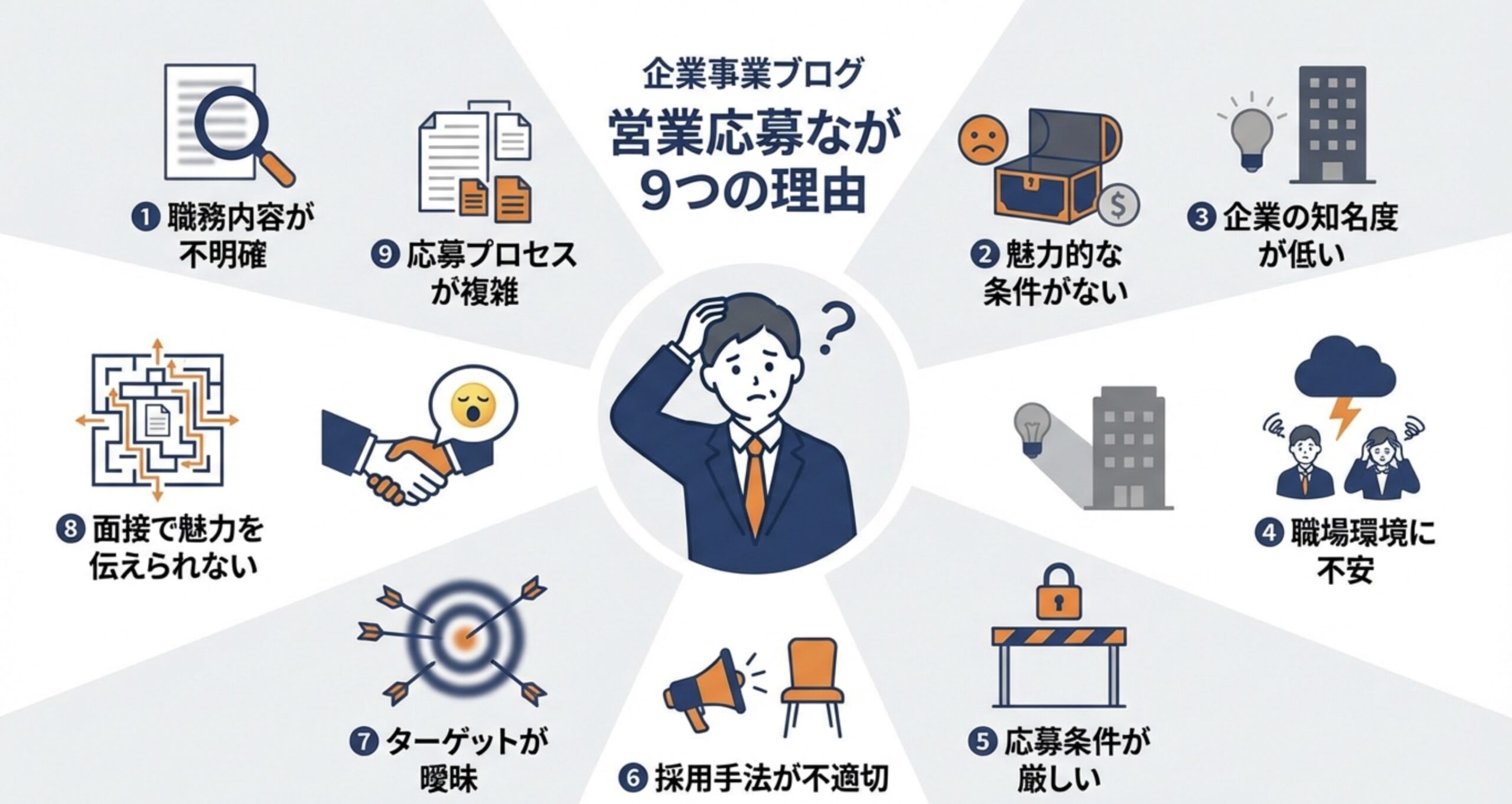 実は、応募がこない理由は、求人広告の内容や採用プロセス、企業の知名度など、さまざまな要因が複雑に絡み合っています。ここでは、営業職の募集がこない理由を9つに分けて、具体的に解説します。