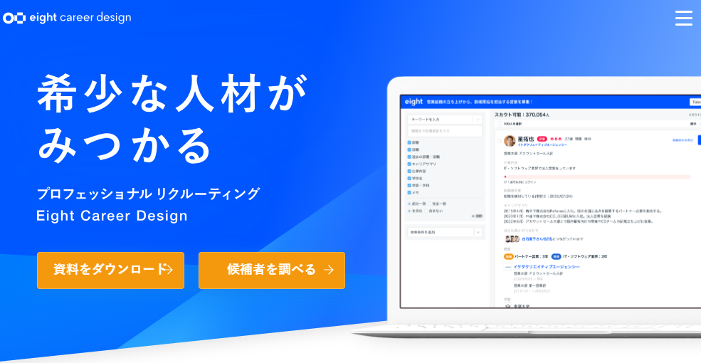 Eight Career Designは、名刺アプリと連動したダイレクトリクルーティングサービスです。転職潜在層を含むビジネス層に直接アプローチできます。