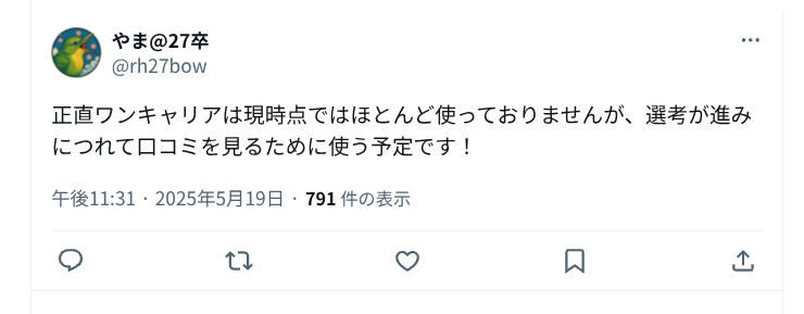 X上では「ワンキャリアの選考体験記が本当に役立った」「企業研究に欠かせないツール」といった肯定的な意見が多数投稿されています。これらの声は、学生がワンキャリアを信頼し、実際に活用している証拠です。