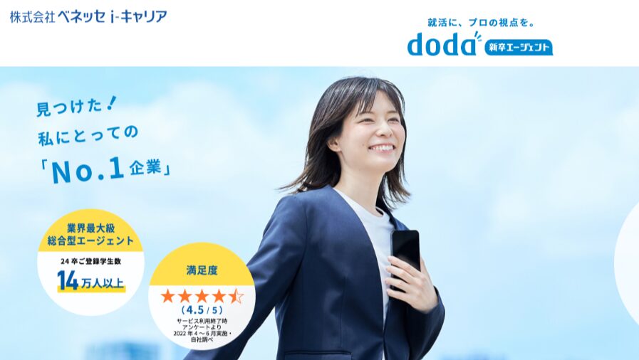 doda新卒エージェントは、ベネッセホールディングスとパーソルキャリアの合弁会社である株式会社ベネッセi-キャリアが運営する新卒採用支援サービスです。登録学生数は140,000名以上(24卒実績)を誇り、年間300回以上の学内登録会を通じてアクティブな就活生のデータベースを構築しています。