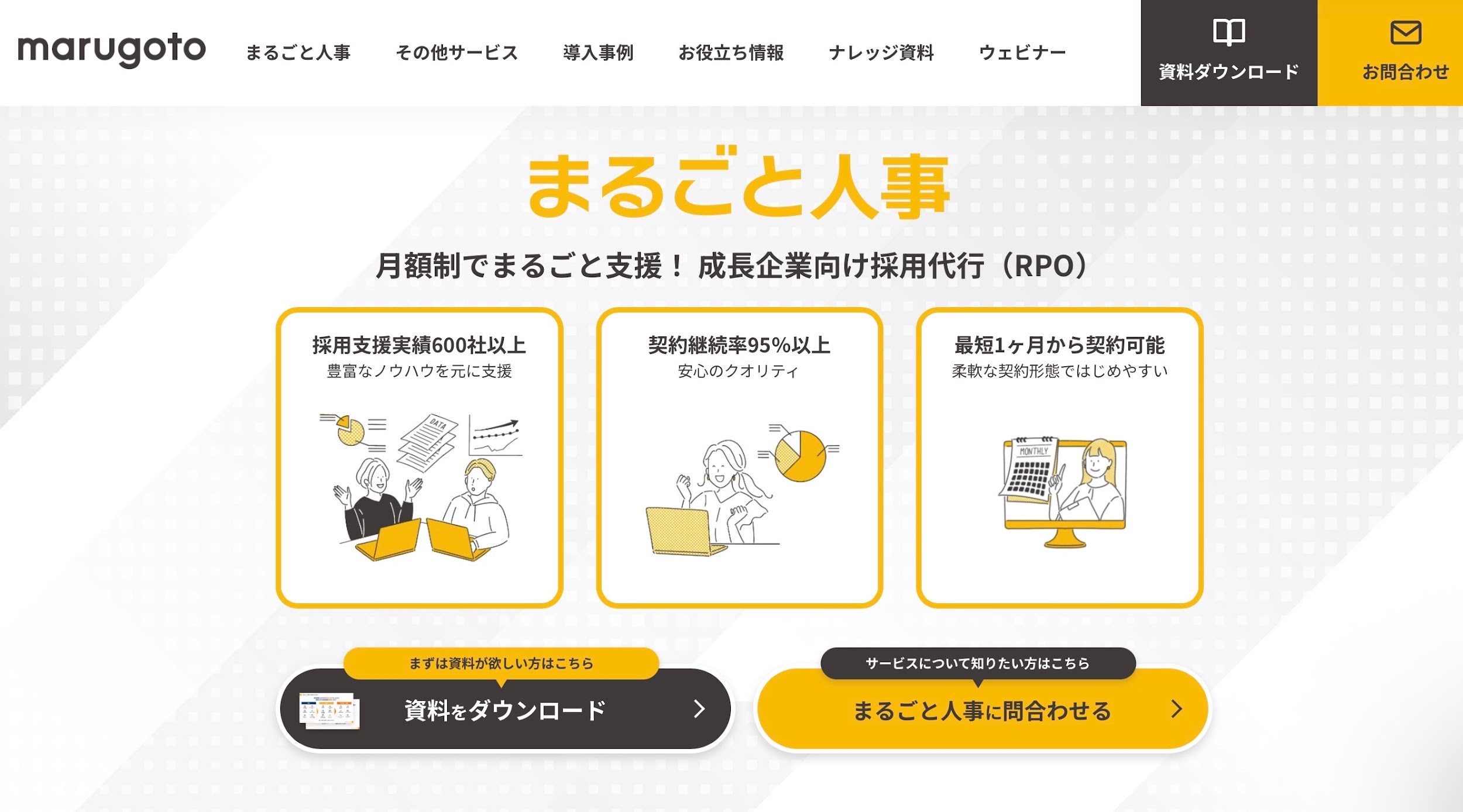 まるごと人事は、その名の通り採用業務を「まるごと」代行してくれるサービスです。採用計画の立案から母集団形成、選考実施、内定者フォローまですべての工程を一括して委託できます。特に少人数の人事部門しかない中小企業や、採用担当者が他の人事業務と兼務している企業にとって、大幅な業務負担軽減につながります。