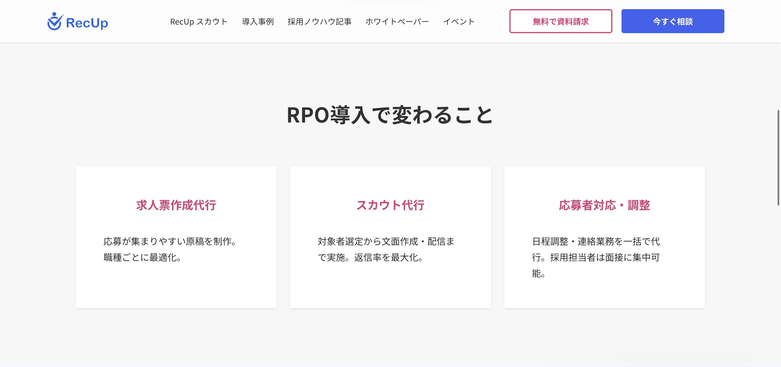 最短3営業日でスカウト配信を開始できるスピード感も強みといえます。無料相談も行っており、RecUp公式サイトから依頼が可能です。
