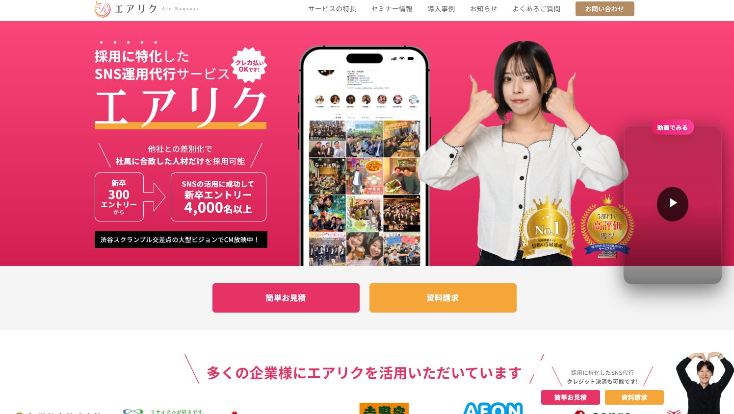 エアリクは、株式会社リソースクリエイションが提供する採用特化型のSNS運用代行サービスです。自社の採用SNS運用で培ったノウハウを凝縮し、他社との差別化を図る独自性のある投稿を実現しています。