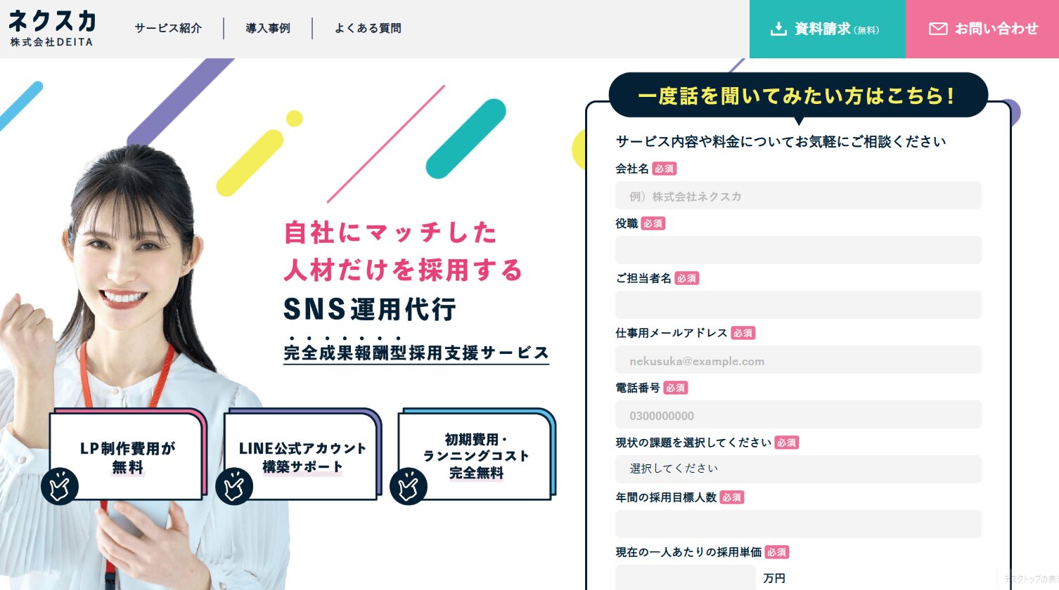 SNS運用代行だけでなく、採用代行業務まで追加費用なしで対応してくれる点も強みとなっています。採用LP制作費用も無料となっており、トータルコストを抑えながら採用活動を強化したい企業におすすめです。