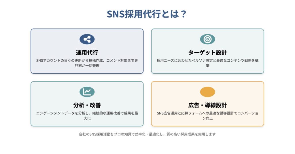 SNS採用代行とは、企業の採用活動におけるSNS運用を専門会社が代わりに行うサービスです。アカウント開設からコンテンツ制作、投稿管理、分析レポートの作成まで幅広い業務を任せることができます。