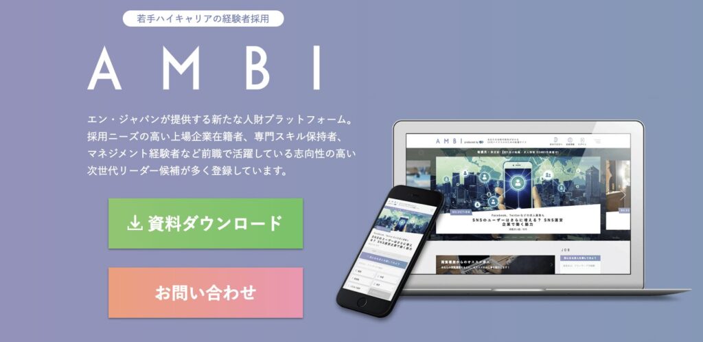 AMBIは、エン・ジャパンが運営する若手ハイキャリア向けの転職サービスです。年収500万円以上の若手ハイポテンシャル層をターゲットにしており、将来の幹部候補となる人材の採用に適しています。