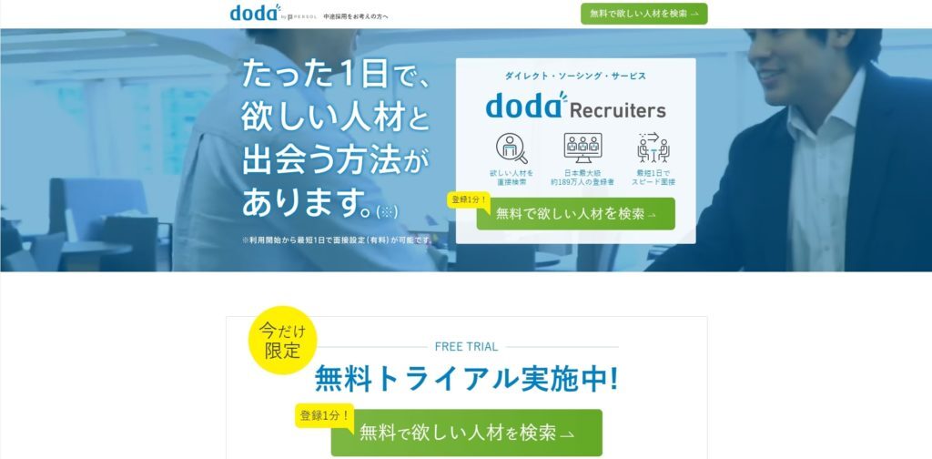 doda Recruitersは、パーソルキャリアが運営する中途採用向けダイレクトリクルーティングサービスです。日本最大級の会員データベースを活用し、幅広い職種・業界の人材にアプローチできる点が大きな強みとなっています。