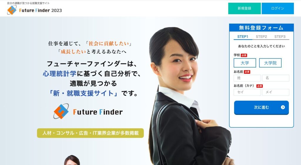 Future Finderは、心理統計学に基づいた適性検査と、それを活用した科学的なマッチングが特徴の新卒採用サービスです。学生の性格特性や価値観を詳細に分析し、企業文化との相性を可視化することで、ミスマッチを減らせる仕組みが構築されています。