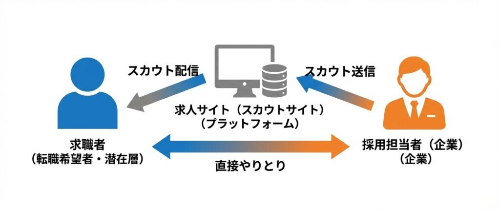 | アプローチ方法 | 企業が求職者に直接スカウトを送信 | エージェントが仲介して候補者を紹介 |