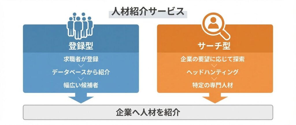 | 登録型 | 求職者が自ら登録し、マッチングを受ける | 転職希望者(顕在層) | 成功報酬型(年収の30〜35%) | 一般職種、中堅クラス |