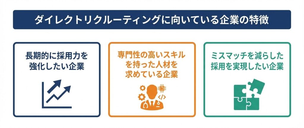 ダイレクトリクルーティングは、自社で採用活動を主体的に行いたい企業や、継続的に複数名を採用する予定がある企業に適しています。初期投資は必要ですが、長期的には採用コストの削減と社内ノウハウの蓄積が期待できます。また、転職潜在層にもアプローチできるため、優秀な人材との出会いの機会が広がります。