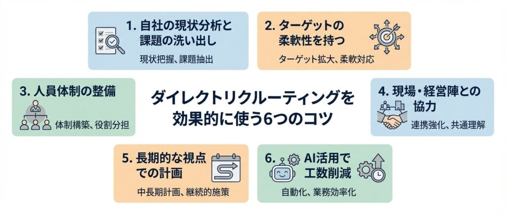 他の採用方法よりも効率的で費用もかからないということが分かりましたが、最後にダイレクトリクルーティングをより効率的に行う6つのポイントを紹介します。