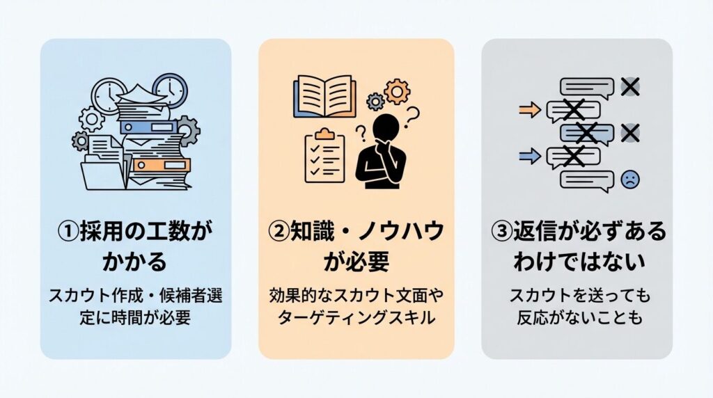 特に候補者のプロフィールを一つひとつ確認し、個別のスカウトメッセージを作成する作業には相当な時間がかかります。また、送信したスカウトへの返信対応や面談日程の調整、その後のフォローアップなど、継続的なコミュニケーションも必要です。