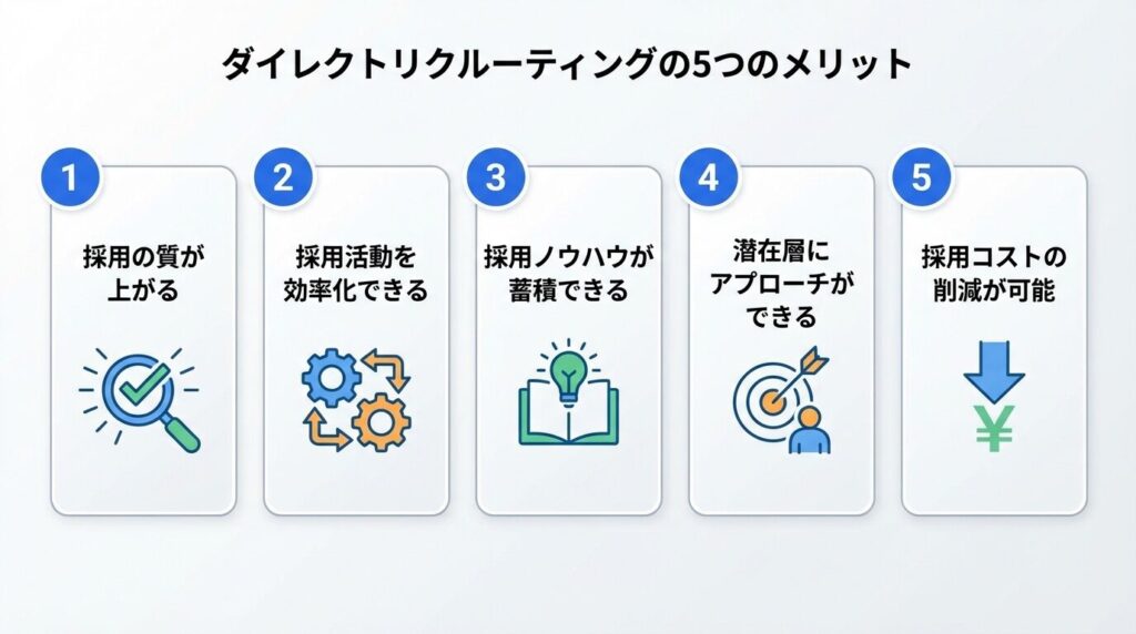 ここでは、ダイレクトリクルーティングがもたらす具体的なメリットについて、5つのポイントから詳しく解説します。