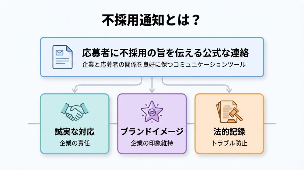 不採用通知とは、採用選考の結果として応募者に不採用の旨を伝える公式な連絡のことです。この通知は単なる結果報告ではなく、企業と応募者の関係を良好に保つための重要なコミュニケーションツールでもあります。適切な不採用通知により、企業の信頼性を保つことができるでしょう。