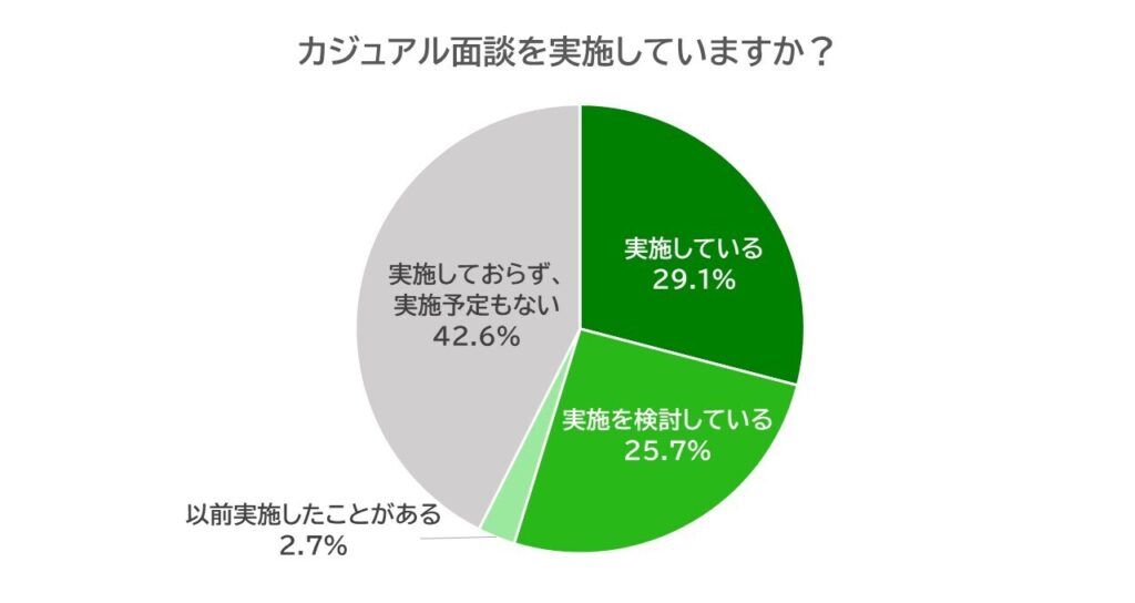 株式会社学情が企業・団体の人事担当者を対象に実施した調査では、経験者(中途)採用においてカジュアル面談を「実施している」と回答した企業が29.1%に上りました。さらに「実施を検討している」という企業も25.7%を占めており、4社に1社以上がカジュアル面談を既に実施または検討している実態が明らかになっています。