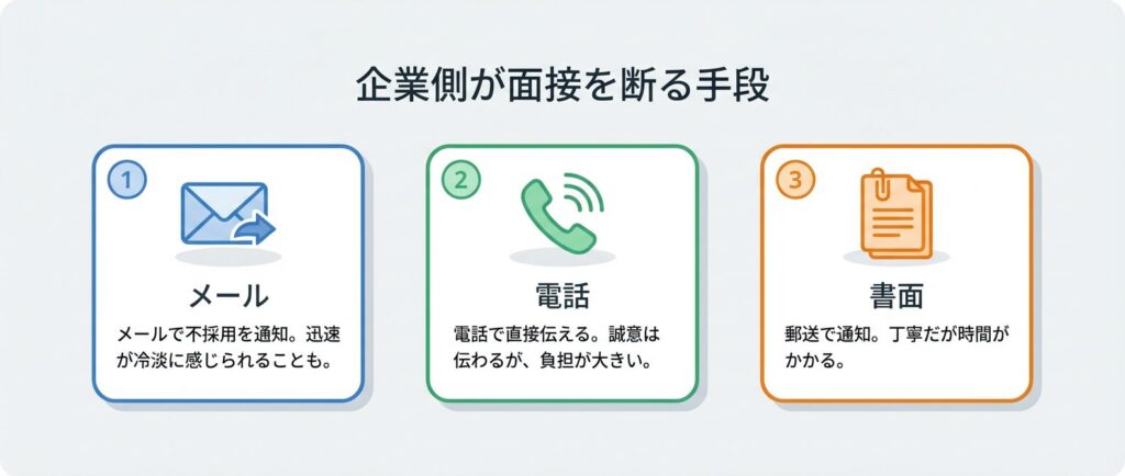 面接の結果を候補者に伝える手段は大きく「メール」「電話」「書面」の3種類があります。それぞれに特性があり、状況や候補者の属性によって使い分けることが重要です。
