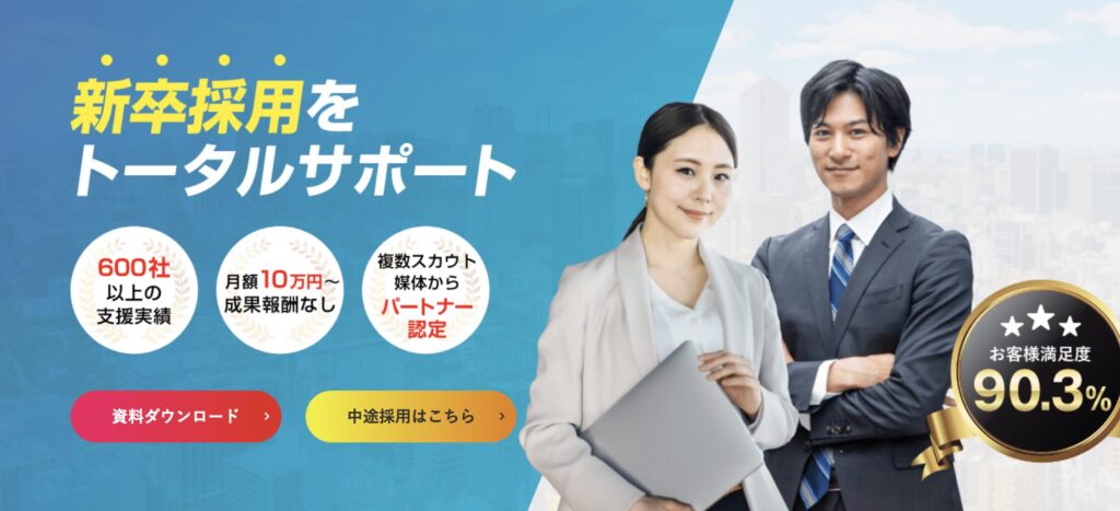 月額固定の料金体系で、求人票作成・スカウト配信・応募者対応・面接調整までを一貫してサポートします。 新卒・中途どちらにも対応しており、最短3営業日でスカウト開始が可能です。