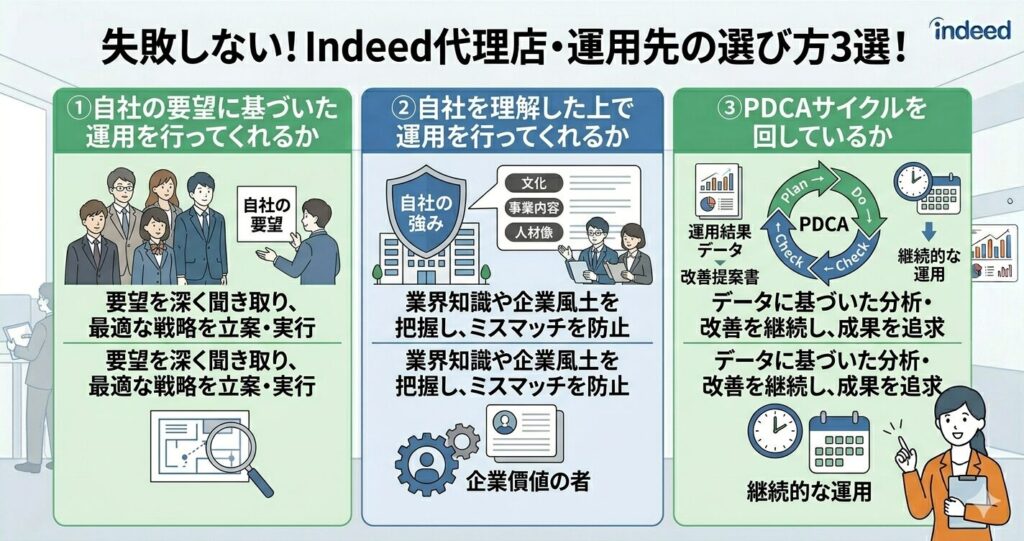 Indeed運用の代理店選びは、採用成果を大きく左右する重要な意思決定です。失敗しないための選定ポイントを以下で解説します。