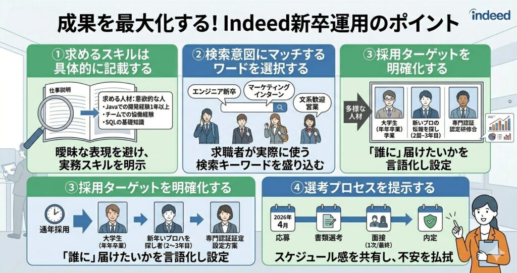 業界用語や企業独自の言い回しばかりを使った原稿は、就活生の検索とすれ違いやすくなります。学生視点の一般職種名(「営業」「エンジニア」「企画」)を使用し、Indeed公式サイトの「2026年求人票作成ガイド」を活用することが重要です。