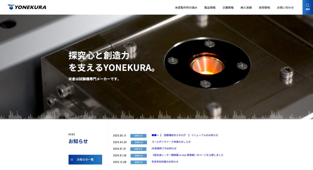 株式会社米倉製作所は、素材の耐久性や耐熱性などを測定する「試験機」を専門に設計・開発・販売するメーカーです。製品開発の基盤を支える存在として、国の研究機関や大学、大手メーカーなど幅広い分野に貢献しています。ものづくりの原点である試験機の開発を一貫して行うことで、最先端技術に触れる機会が多く、世界からも注目を集める企業といえるでしょう。