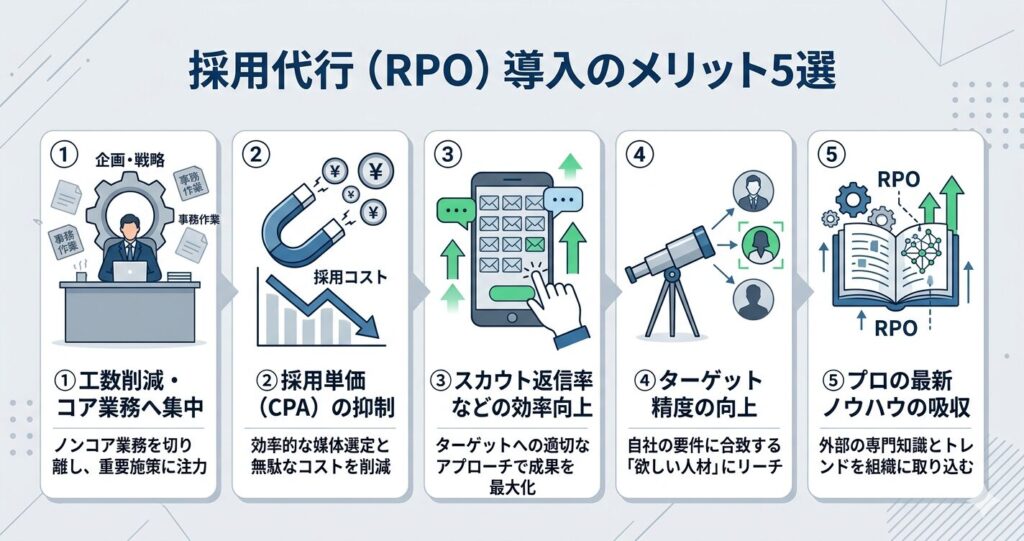 採用代行を導入することで得られるメリットは、コスト面や業務効率だけでなく、採用の質そのものを向上させる効果も含まれます。ここでは、代表的な5つのメリットについて詳しく解説します。