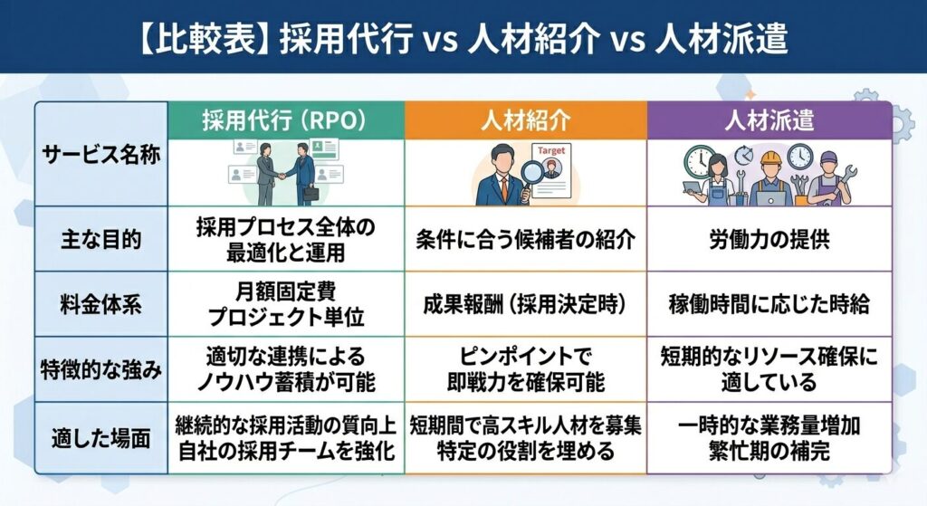 似たサービスとして人材紹介や人材派遣がありますが、それぞれ目的や費用体系が異なるため、自社の課題に応じた選択が重要です。