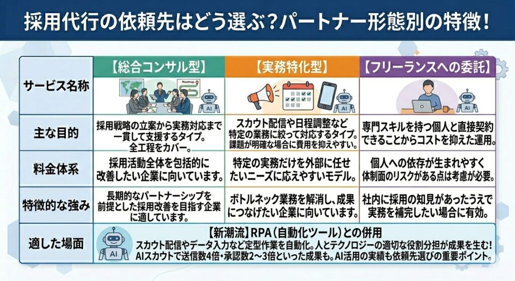 採用代行の依頼先は「総合コンサル型」「実務特化型」「フリーランスへの委託」の3つに大別されます。それぞれ強みと注意点が異なるため、自社の採用課題や予算規模に応じた選択が重要です。