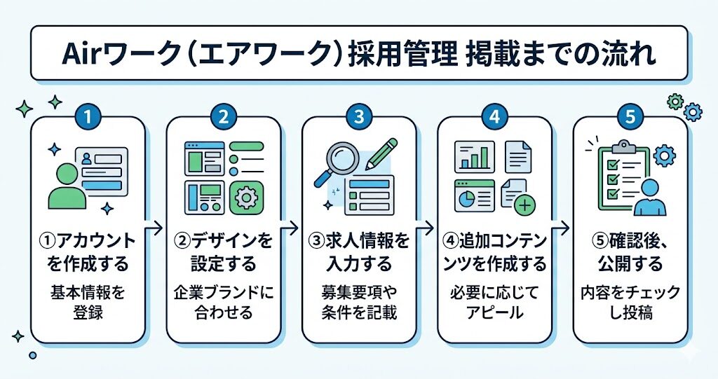 この章では、Airワーク 採用管理でアカウントを作成してから求人を公開するまでの手順を整理しています。
