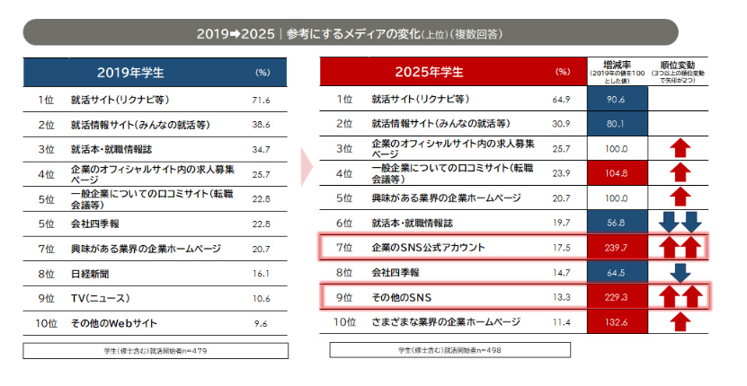パーソル総合研究所の就職活動に関する調査によると、2019年と2025年で求職者が参考にするメディアの順位に大きな変化が生じていることがわかります。2025年学生の回答では「企業のSNS公式アカウント」が2019年比239.7%、「その他のSNS」が229.3%と大幅に増加しており、企業のオウンドメディアやSNSへの注目度が急速に高まっていることが読み取れます。