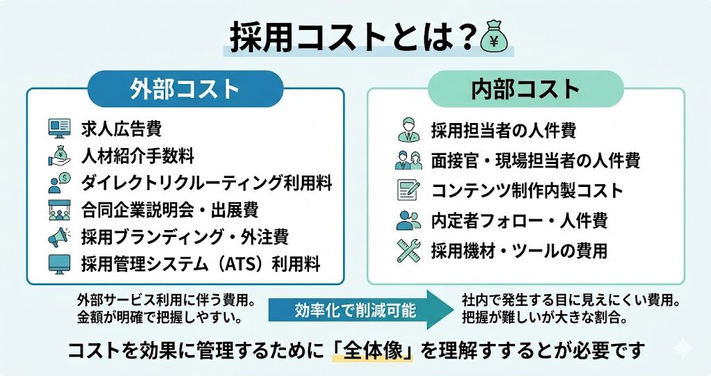 採用コストとは、人材を採用するために発生するすべての費用の総称です。求人広告費や紹介手数料といった見えやすいコストだけでなく、社内の人件費や業務工数など、見えにくいコストも含まれます。まずは構成要素を正確に把握することが、コスト管理の出発点になります。