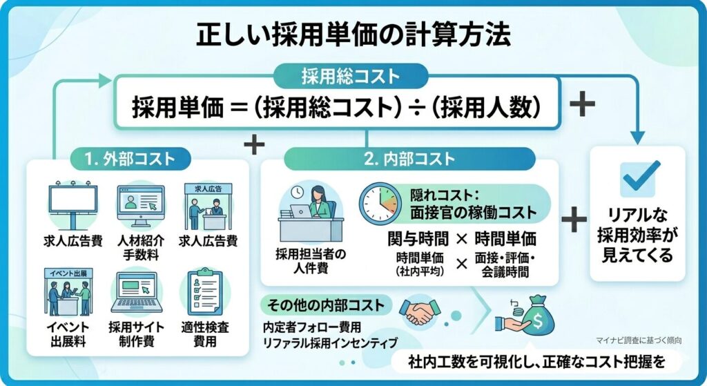 採用単価は「採用総コスト ÷ 採用人数」という計算式で求めることができます。この計算を正確に行うためには、外部コストだけでなく「内部コスト」も含めて集計することが欠かせません。