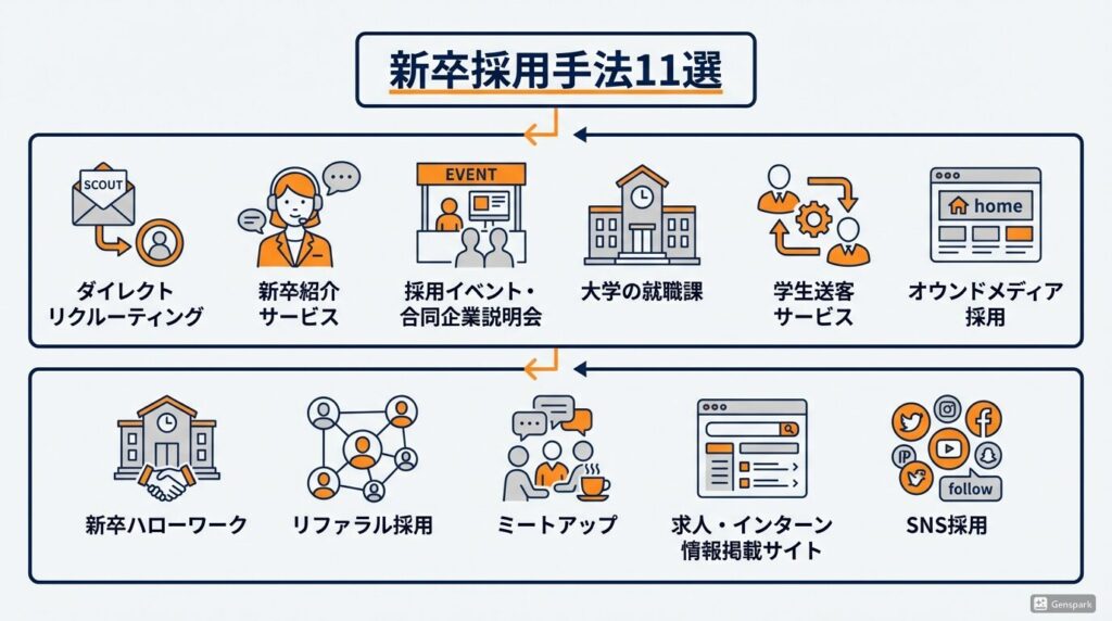 従来の就職サイトや合同説明会だけでなく、ダイレクトリクルーティングやSNS採用など、新しい手法も積極的に取り入れることで、より幅広い学生層にアプローチできます。ここでは代表的な11の採用手法について、それぞれのメリット・デメリット・費用相場・おすすめサービスを詳しく解説します。